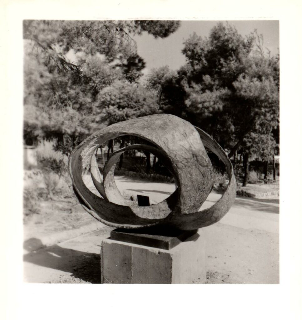 Black-and-white printed photograph of a sculpture by Barbara Hepworth, which was presented at the 1st World Exhibition “Panathenaea of Contemporary Sculpture” held in Athens.