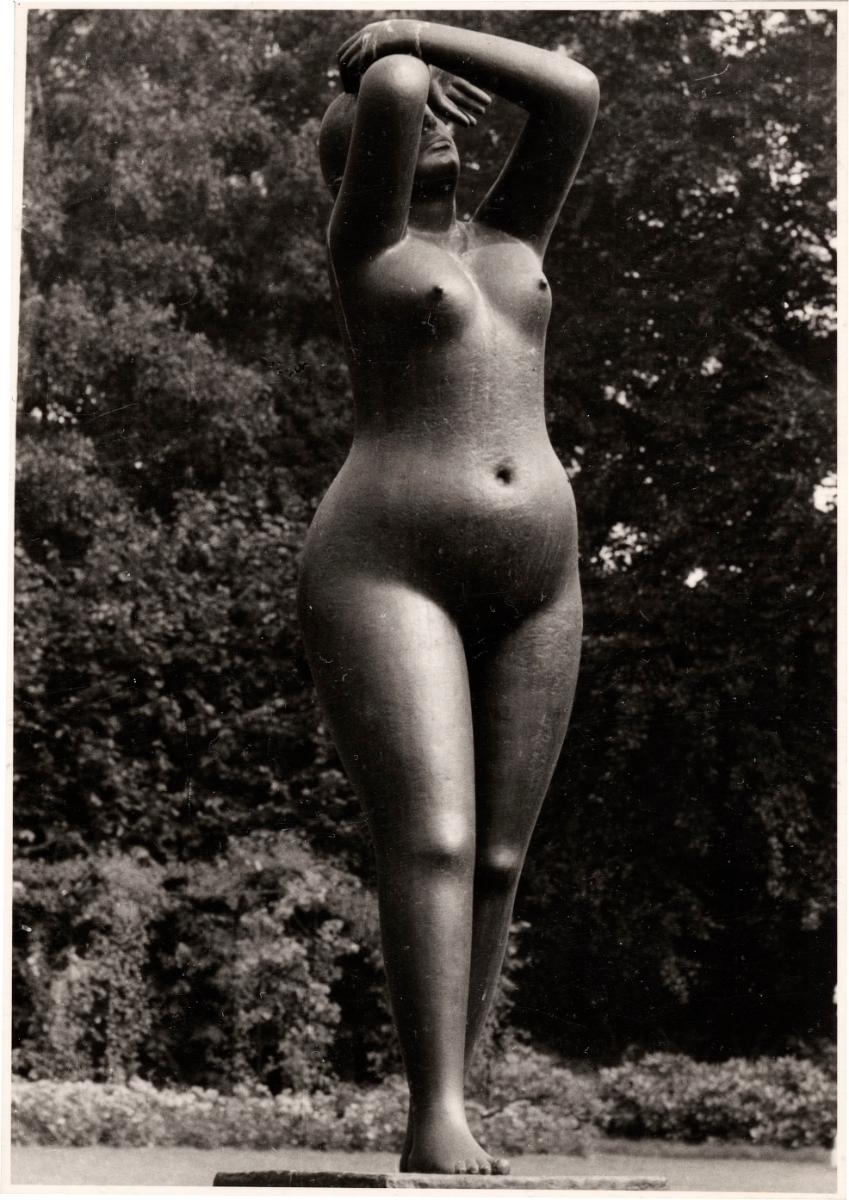 Black-and-white printed photograph of a sculpture by Oskar Jespers, which was presented at the 1st World Exhibition “Panathenaea of Contemporary Sculpture” held in Athens. On the reverse, inscription.