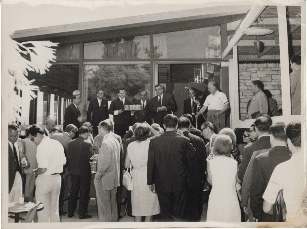 A black-and-white printed photograph from the opening of the “Panathenaia of Contemporary Sculpture” exhibition in Athens.