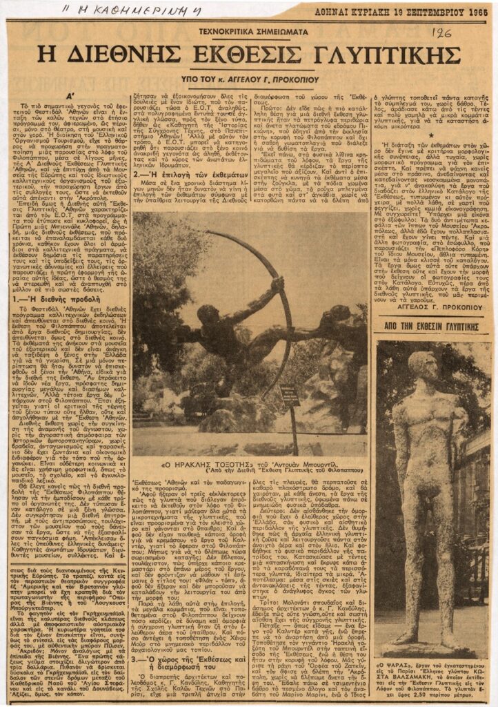 A clipping from the newspaper “I Kathimerini”, dated September 19, 1965, featuring a review of the”Panathenaea of Contemporary Sculpture” exhition held in Athens. The article discusses the exhibition’s organization and promotion, the selection of presented works of art, the venue, as well as some resulting problems.