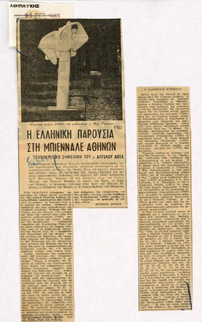 A clipping from the newspaper “Athinaiki”, dated September 21, 1965, featuring a review of the “Panathenaea of Contemporary Sculpture” held in Athens with particular mention of some the works by Greek and foreign artist being presented.