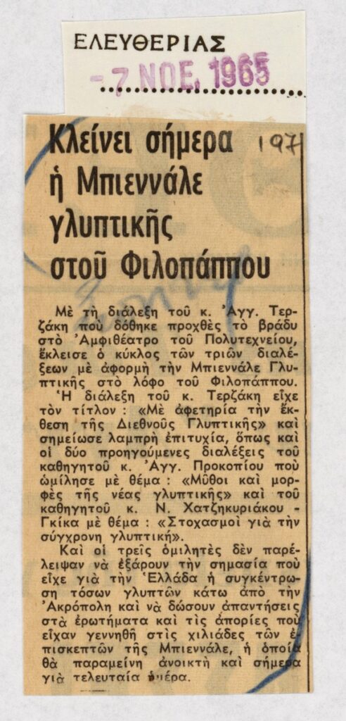 A clipping from the newspaper “To Vima”, dated November 7, 1965, featuring an article about the lecture by Angelos Terzakis closing a cycle of even in the wake of the “Panathenaea of Contemporary Sculpture” exhibition held in Athens.