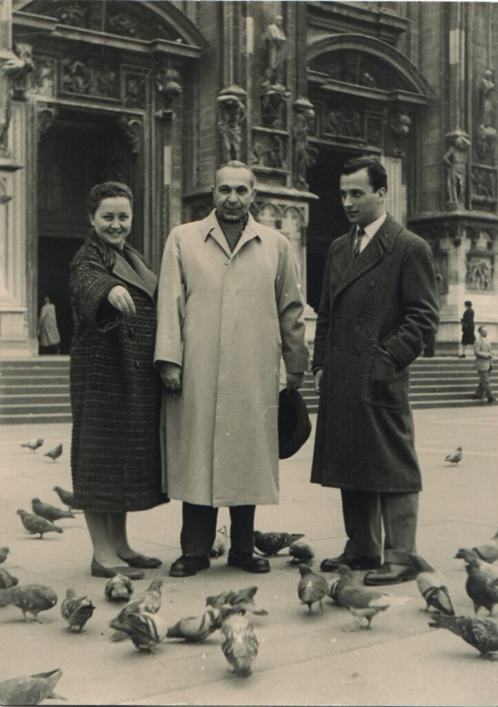 Aliki and Nestor Teloglou on a trip to Milan accompanied by an unidentified person.