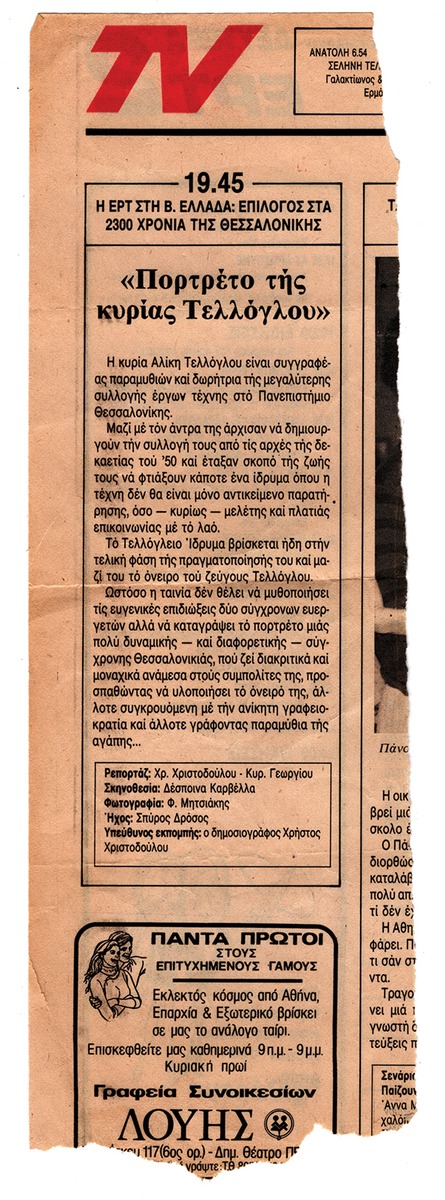 A clipping from the newspaper “I Avgi”, dated November 5, 1985, featuring an article about Aliki Teloglou.