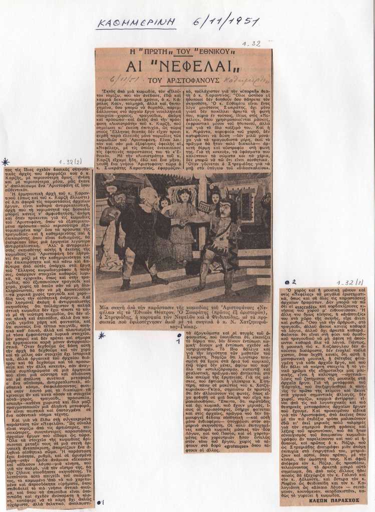 A clipping from the newspaper “I Kathimerini”, dated November 6, 1951, featuring a review of the Aristophanes’ “Clouds’ staging by the National Theater in Athens directed by Sokratis Karatinos.