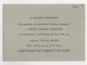 Katraki Vaso (1914 - 1988) ; Valsamakis Panos (1900 - 1986) ; Vassiliou Spyros (1902 - 1985) ; Orestis Kanellis (1910 - 1979) ; Tassos (Anastasios Alevizos) (1914 - 1985) ; Eleni Vakalo (1921 - 2001) ; Hatzikyriakos-Ghika Nikos (1906 - 1994) ; Papaloukas Spyros (1892 - 1957) ; Asteriadis Aghinor (1898 - 1977) ; Τέρψη Κυριακού (1916 - 1993) ; Sikeliotis Giorgos (1917 - 1984) ; Migadis Yannis (1926 - 2017) ; Houtopoulou-Contaratou Sosso (1923 - 1984) ; Yannis Grammatikopoulos (1928) ; Kapralos Christos (1909 - 1993) ; Argyrakis Minos (1920 - 1998) ; Markellos Thodoros (1925 - 2015) ; Arlioti Lili (1908 - 1979) ; Kontopoulos Alekos (1904 - 1975) ; Vakalo Giorgos (1902 - 1991) ; Karantinos Sokratis (1906 - 1979) ; Nikos Gavriil Pentzikis (1908 - 1993) ; Houtzoumi Vera (1920 - 2007) ; Νικόλαος Βλαβιανός (1929) ; Χαρίκλεια Αλεξανδρίδου-Στεφανοπούλου (1889 - 1963) ; Ελένη Θεοχάρη-Περάκη ; Zachariou Fotis (1909 - 2001) ; Zepos-Alafouzos Emmanuel (1905 - 1995) ; Theodoropoulos Angelos (1883 - 1965) ; Μαρία Αναγνωστοπούλου-Βρανίκα (1890 - 1971) ; Δημήτριος Κεντάκας ; Άγγελος Κόντης (1912 - 2005) ; Manousakis Giorgos (1914 - 2003) ; Ιωάννα Ασμάνη (1929) ; Papa Aglaïa (1904 - 1984) ; Paralis Giorgos (1908 - 1975) ; Kostas Plakotaris (1902 - 1969) ; Stamatopoulos Stamatis ; Anagnostopoulos Giorgos (20th century) ; Vampoulis Petros (1929) ; Φώτης Φωτιάδης ; Μιχαήλ Κανάκης