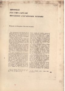 Dika Korneti Penny (1945) ; Yiannadakis, Manolis (1954) ; Katsiani, Alexandra (1954) ; Chondros Thanasis (1953) ; Kilessopoulos, Apostolos (1942) ; Νίκος Κούτουλας (1943) ; Ρηνιώ Μουρέλου-Κυριαζίδη (1952) ; Τζοβανάκης ; Γεράσιμος Καραντινός ; Θανάσης Μπακογιώργος (1942) ; Φλοριάννα Ηλιοπούλου ; Stavroudi, Katy (1933 - 2015) ; Χριστιάνα Ηλιοπούλου ; Θανάσης Μανούσης ; Rogkotis Vasilis (1915 - 1999) ; Ανδρέας Ζαμπέτογλου (1936 - 2006) ; Μάνια Ζιώγα ; Carita Schmidt ; Δημήτρης Βλαχογιάννης (1965) ; Βάλια Δαβράδου (1969) ; Κωνσταντίνος Καρανός ; Ντίνος Παπασπύρου (1938 - 2024) ; Τάρση Τζενανίδου ; Dellatola-Batziou, Konstantina (1931 - 2015) ; Ελένη Θεοφύλακτου ; Ραφαήλ Ιωαννίδης ; Δημήτρης Λιολιόπουλος ; Sphicas Nicolas (1961) ; Κατερίνα Νικόλτσου-Ματεζόφσκυ ; Νικόλαος Πιλάτης (1944) ; Βασιλική Καραμπατάκη ; Νίκος Σταυρακαντωνάκης ; Hanne Voukalis ; Βασίλης Νατσιούλας ; Ελπίδα Τσιλιπάκου ; Ζαχαρίας Κουμπλής ; Τάκης Τσεντεμαΐδης (1944 - 2019) ; Νικόλας Κυριακού ; Κωνσταντίνος Τσέλιος (1941) ; Ρένα Τσιτώτα (1942) ; Χάρης Λαδόπουλος ; Νίκος Μαραγκός ; Βασίλειος Ιωαννίδης ; Μαρία Κομπατσιάρη ; Μαίρη Κυριαζοπούλου ; Σωτήρης Μουστάκας ; Σώτος Ζαχαριάδης ; Αθανάσιος Καραμήτας ; Νικόλας Μπλιάτκας (1962)