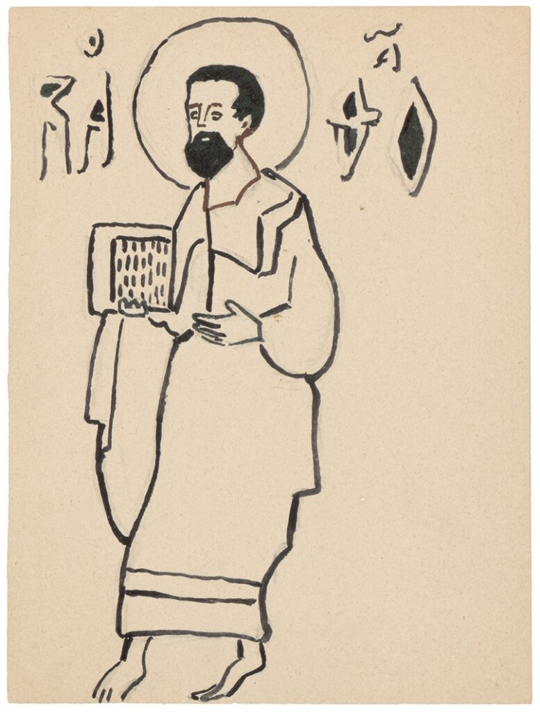 Αντιγράφει μορφή από το μολδαβικό επιτραχήλιο Γαβριήλ και Σοφίκας (1555) της Ιεράς Μονής Σταυρονικήτα Αγίου Όρους