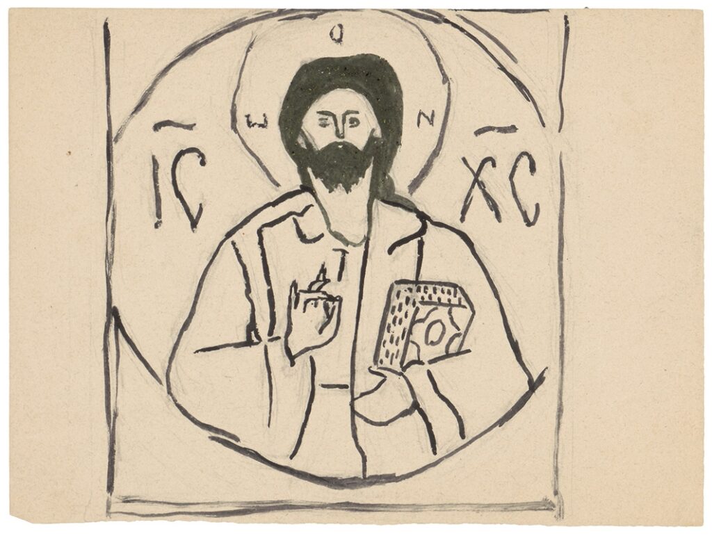 Αντιγράφει μορφή από το μολδαβικό επιτραχήλιο Γαβριήλ και Σοφίκας (1555) της Ιεράς Μονής Σταυρονικήτα Αγίου Όρους