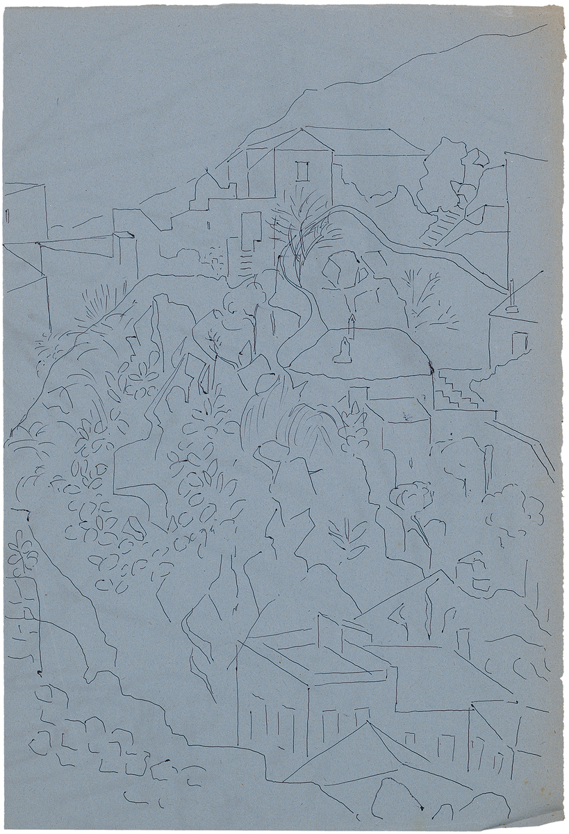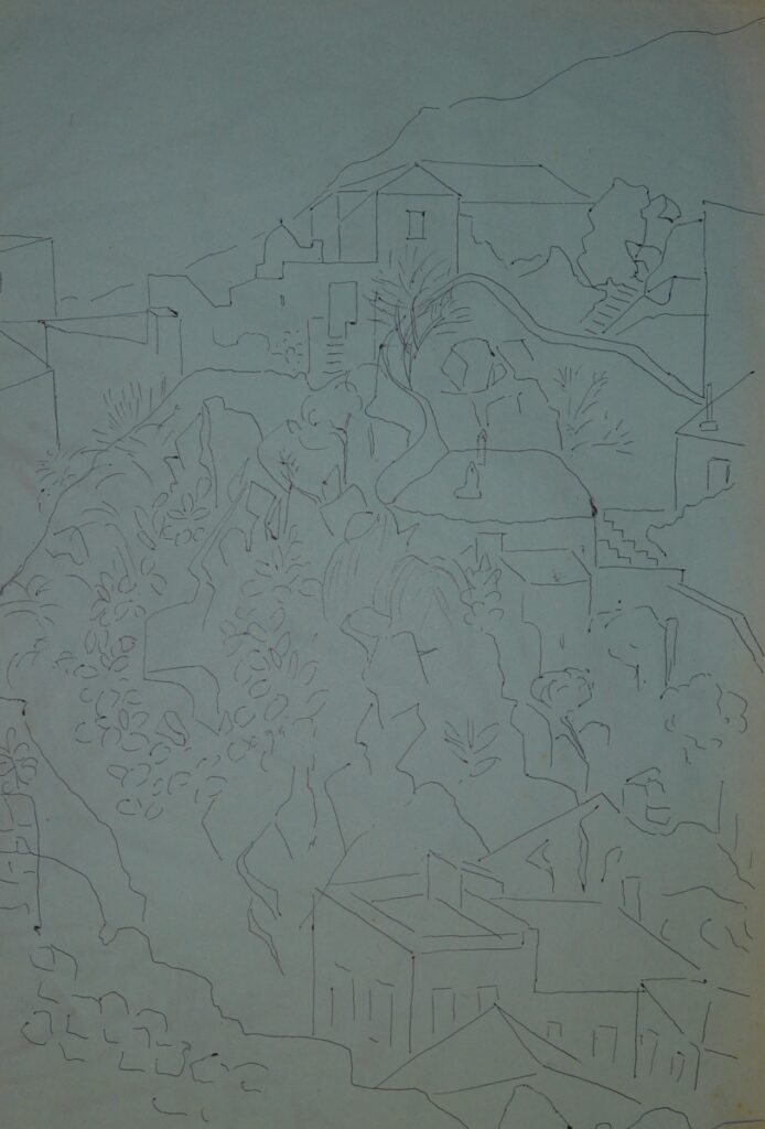 Σχέδιο με πενάκι σε γαλάζιο χαρτί