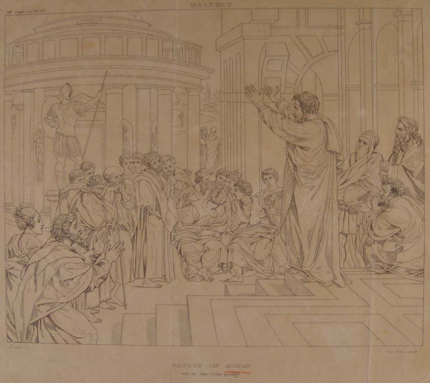 Εικονίζεται σκηνή ομιλίας του Απόστολου Παύλου στην Αγορά της Αθήνας. Στα δεξιά ο Παύλος με υψωμένα τα χέρια απευθύνεται προς μια ομάδα ανθρώπων διευθετημένων ημικυκλικά. Αρχαιοελληνικά αρχιτεκτονήματα και αγάλματα εντείνουν την αίσθηση του βάθους στο δεύτερο επίπεδο.