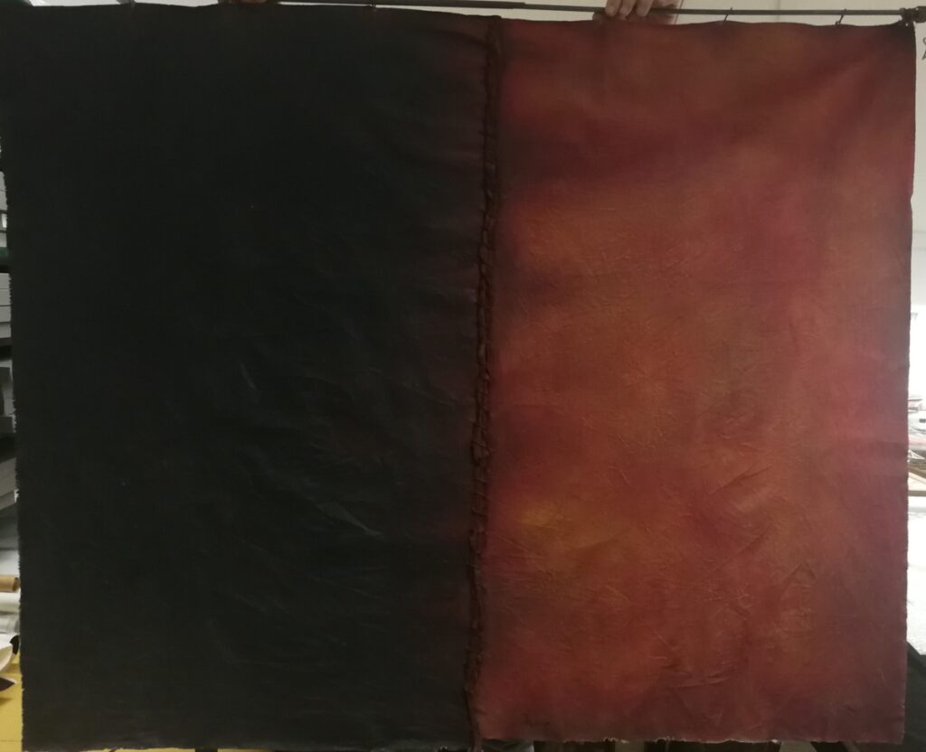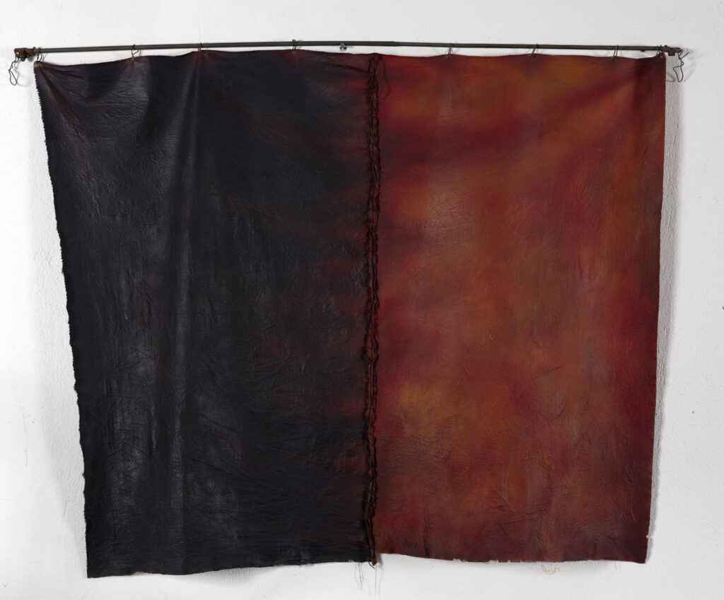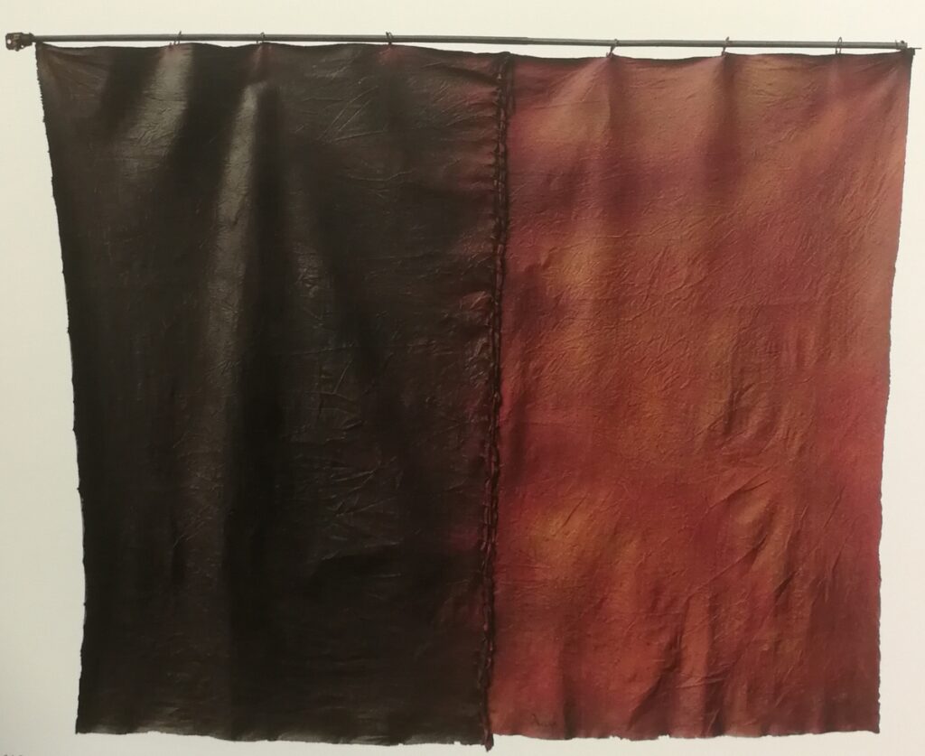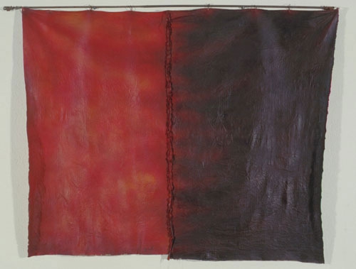 Από μια μεταλλική βέργα κρέμονται με τη βοήθεια 7 συρμάτινων κρίκων δύο κομμάτια υφάσματος που είναι ραμμένα στη μέση με αδρές βελονιές. Το κομμάτι δεξιά είναι έντονα κόκκινο με αποχρώσεις της ώχρας να το ξανοίγουν σε διάφορα σημεία. Το κομμάτι αριστερά στο σημείο επαφής των δύο κομματιών παρακολουθεί τις αποχρώσεις του διπλανού για να εξελιχτεί σε βαθυκόκκινο και τελικά μαύρο.