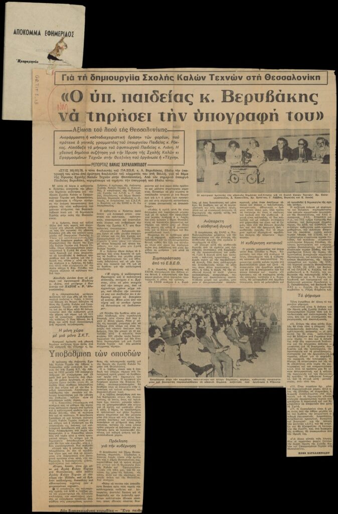 Απόκομμα της εφημερίδας «Θεσσαλονίκη» (04/05/1984), όπου δημοσιεύεται άρθρο για τη δημόσια συζήτηση με θέμα την ίδρυση τμήματος Σχολής Καλών Τεχνών στη Θεσσαλονίκη, που οργάνωσε η Μακεδονική Καλλιτεχνική Εταιρεία «Τέχνη».
