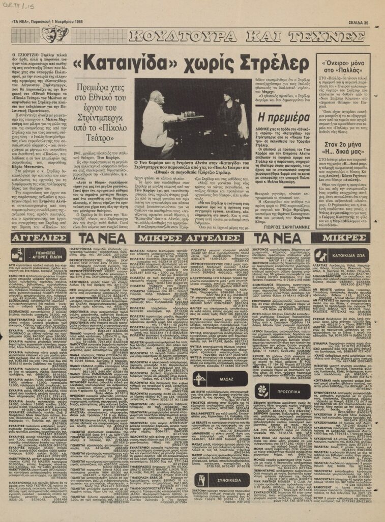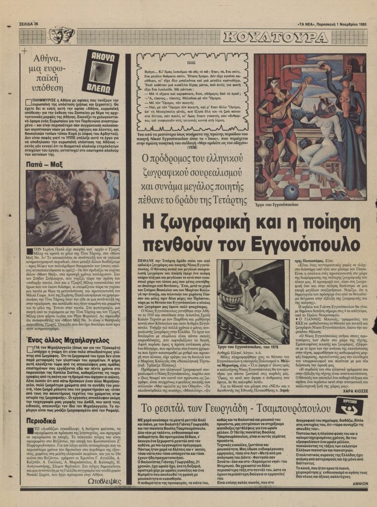Απόκομμα της εφημερίδας «Τα Νέα» (01/11/1985), όπου δημοσιεύεται άρθρο με αφορμή τον θάνατο του ζωγράφου Νίκου Εγγονόπουλου.
