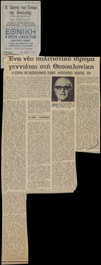 Απόκομμα της εφημερίδας «Η Καθημερινή» (04/11/1984), όπου δημοσιεύεται άρθρο με θέμα το όραμα του ζεύγους Τέλλογλου για την ίδρυση του Τελλογλείου Ιδρύματος με ιδιαίτερη αναφορά στις εκδόσεις του και τη δωρεά του Τώνη και της Ιωάννας Σπητέρη.