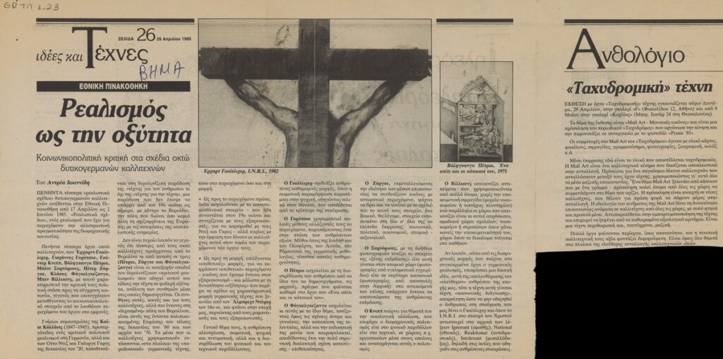 Απόκομμα της εφημερίδας «Το Βήμα» (28/04/1985), όπου δημοσιεύεται κριτική της έκθεσης σχεδίων οκτώ εικαστικών καλλιτεχνών από τη (τότε) Δυτική Γερμανία στην Εθνική Πινακοθήκη στην Αθήνα.