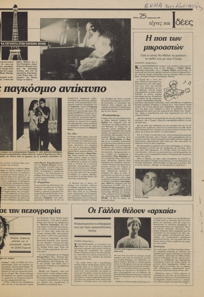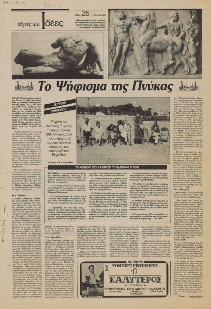 Απόκομμα της εφημερίδας «Το Βήμα» (03/02/1985), όπου δημοσιεύεται άρθρο για το επονομαζόμενο «Ψήφισμα της Πνύκας» που δηλώνει τη συμπαράσταση της Διεθνούς Ένωσης Κριτικών Τέχνης (AICA) στο ελληνικό αίτημα επιστροφής των Μαρμάρων του Παρθενώνα.
