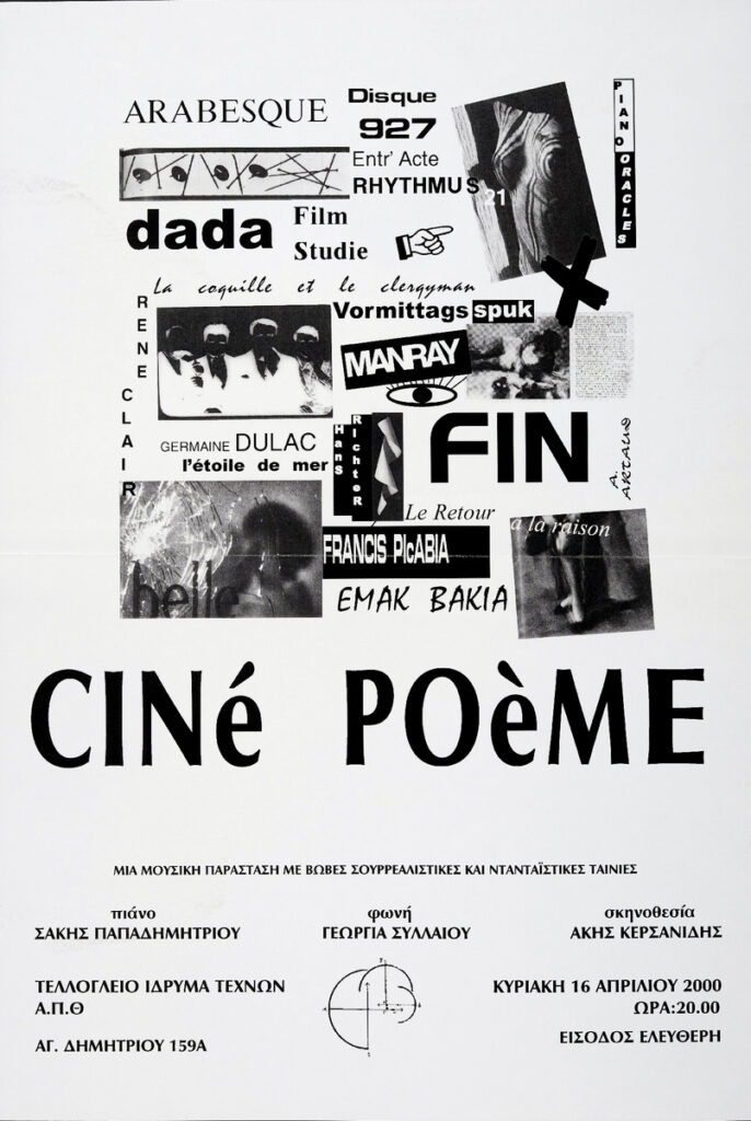 Αφίσα της μουσικής παράστασης με παράλληλη προβολή ταινιών από τον βουβό και ντανταϊστικό κινηματογράφο, που πραγματοποιήθηκε στο Τελλόγλειο Ίδρυμα τον Απρίλιο του 2000.