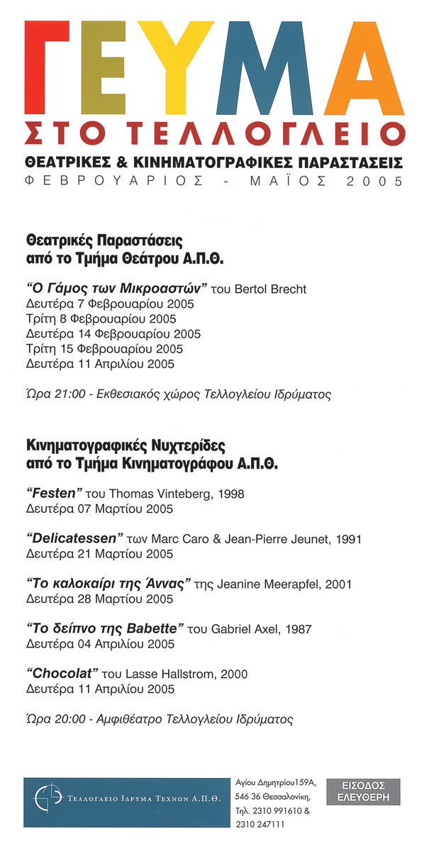 Πρόγραμμα θεατρικών παραστάσεων και κινηματογραφικών προβολών στο πλαίσιο της έκθεσης “Γεύμα στο Τελλόγλειο” που διοργανώθηκε στο Τελλόγλειο Ίδρυμα στη Θεσσαλονίκη.
