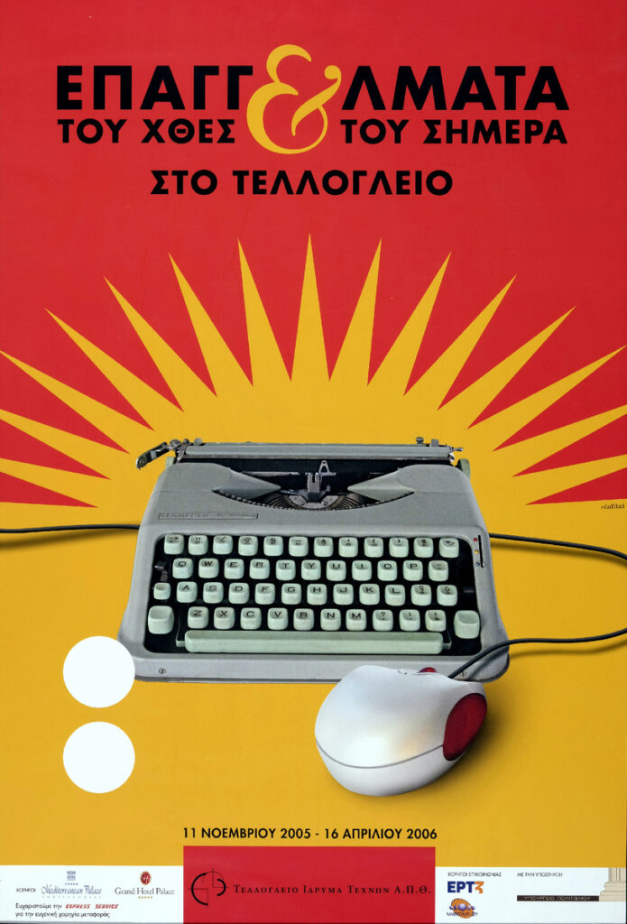 Αφίσα έκθεσης με θέμα μία αναδρομή στην Ελλάδα του παρελθόντος μέσα από έργα τέχνης, μακέτες σκηνικών από κινηματογραφικές ταινίες και αντικείμενα που αφορούν την καθημερινή εργασία, που έλαβε χώρα στο Τελλόγλειο Ίδρυμα Τεχνών στη Θεσσαλονίκη.
