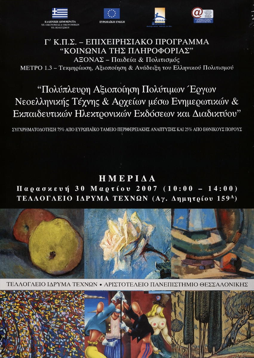 Αφίσα ημερίδας που διοργανώθηκε στο πλαίσιο της δράσης τεκμηρίωσης, αξιοποίησης & ανάδειξης του Ελληνικού Πολιτισμού, Γ’ Κ.Π.Σ. – Επιχειρησιακό Πρόγραμμα «Κοινωνία της Πληροφορίας», άξονας – Παιδεία & Πολιτισμός, που υλοποίησε το Τελλόγλειο Ίδρυμα στη Θεσσαλονίκη.