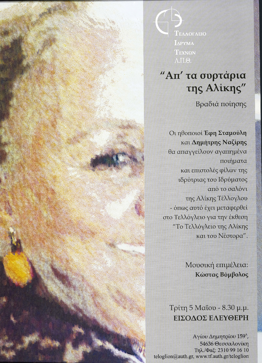 Αφίσα βραδιά ποίησης με απαγγελία αγαπημένων ποιημάτων και επιστολών φίλων της ιδρύτριας του Ιδρύματος, που πραγματοποιήθηκε στο Τελλόγλειο Ίδρυμα στη Θεσσαλονίκη στο πλαίσιο των παράλληλων εκδηλώσεων της έκθεσης «Το Τελλόγλειο της Αλίκης και του Νέστορα».