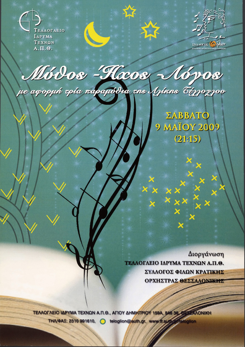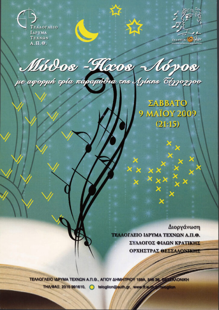 Αφίσα μουσικής εκδήλωσης με αφορμή τρία παραμύθια της Αλίκης Τέλλογλου, που διοργανώθηκε σε συνεργασία με τον Σύλλογο Φίλων Κρατικής Ορχήστρας Θεσσαλονίκης στο Τελλόγλειο Ίδρυμα στη Θεσσαλονίκη στο πλαίσιο των παράλληλων εκδηλώσεων της έκθεσης «Το Τελλόγλειο της Αλίκης και του Νέστορα».