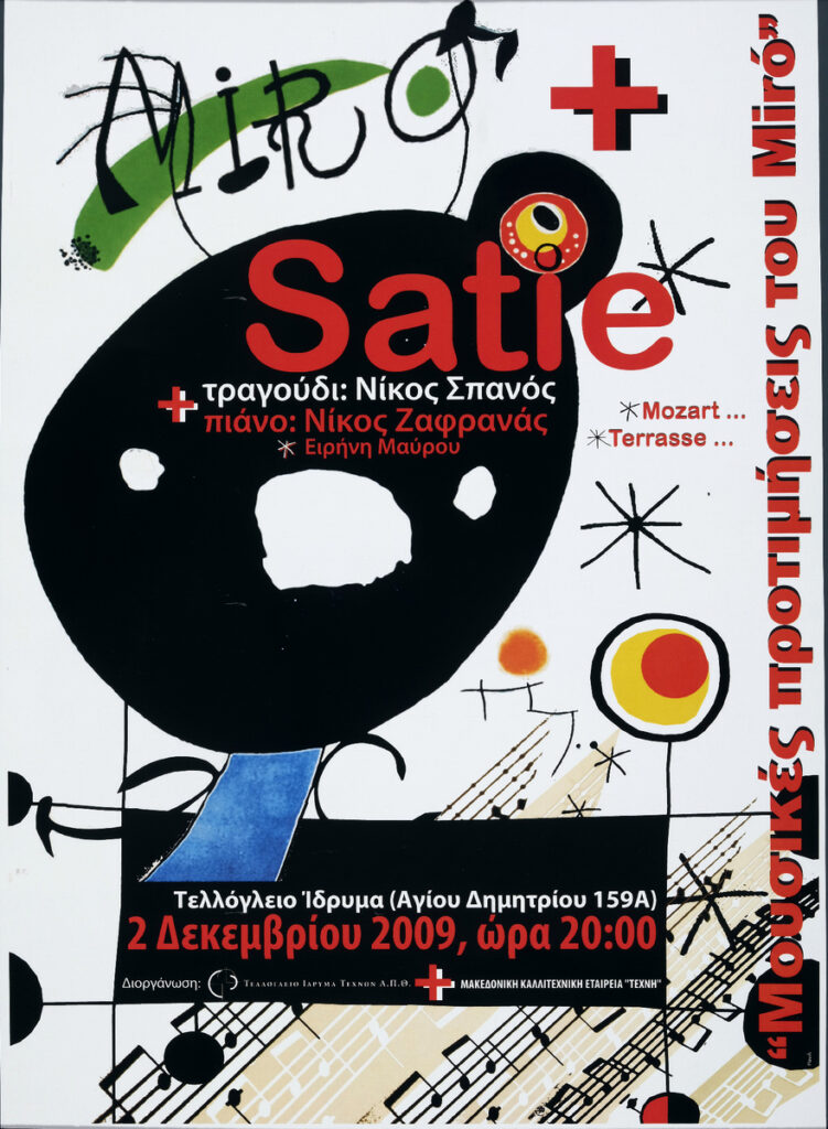 Αφίσα συναυλίας του Νίκου Σπανού (κόντρα τενόρος), του Νίκου Ζαφρανά (πιάνο) και της Ειρήνης Μαύρου (πιάνο) με έργα Satie, Mozart και Terrasse που πραγματοποιήθηκε στο Τελλόγλειο Ίδρυμα Τεχνών στη Θεσσαλονίκη στο πλαίσιο των παράλληλων εκδηλώσεων της έκθεσης «Ο Miró της Μαγιόρκα».