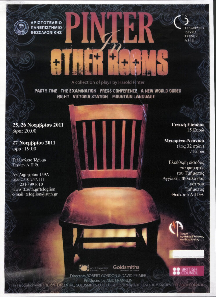 Αφίσα θεατρικών παραστάσεων έργων του Harold Pinter από τη θεατρική ομάδα του Τμήματος Αγγλικής Γλώσσας και Φιλολογίας και του Τμήματος Θεάτρου του ΑΠΘ, που πραγματοποιήθηκαν στο Τελλόγλειο Ίδρυμα στη Θεσσαλονίκη.