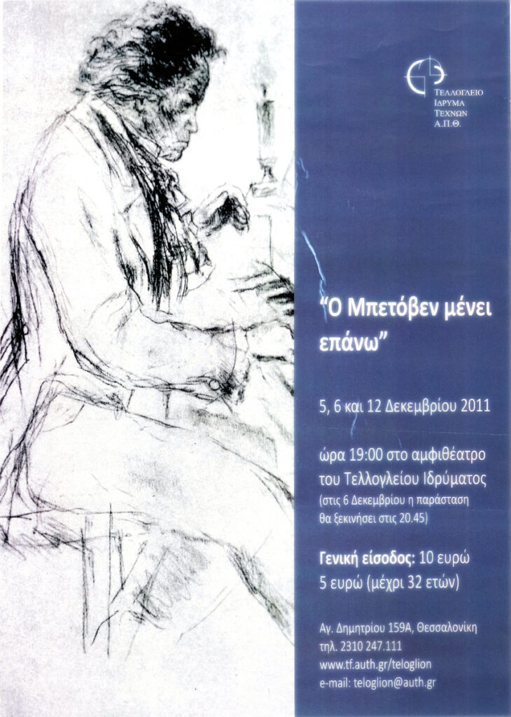 Αφίσα θεατρικών παραστάσεων που πραγματοποιήθηκαν στο Τελλόγλειο Ίδρυμα στη Θεσσαλονίκη ως παράλληλες εκδηλώσεις της έκθεσης κειμηλίων του συνθέτη από το Beethoven-Ηaus της Βόνης.