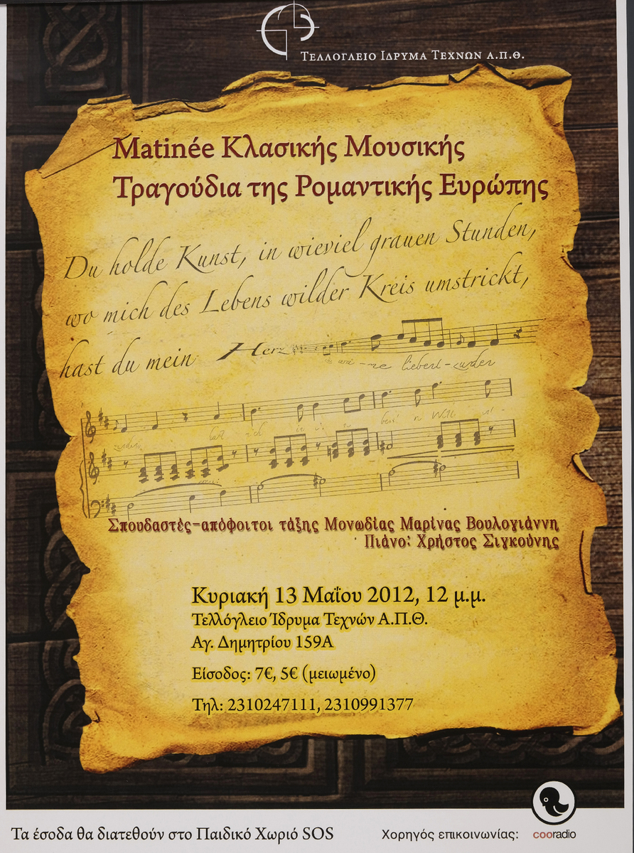 Αφίσα συναυλίας μονωδίας με έργα της ρομαντικής περιόδου από κύκλο συναυλιών (matinée) στο Τελλόγλειο Ίδρυμα στη Θεσσαλονίκη.