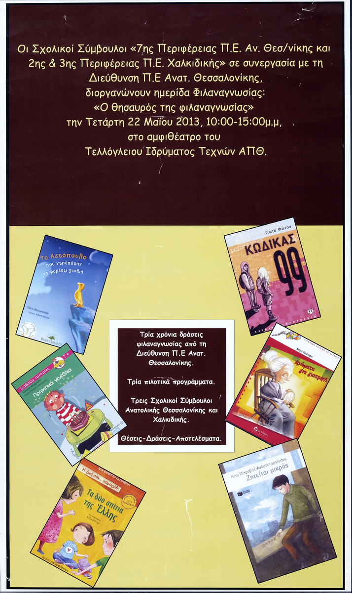 Αφίσα ημερίδας που διοργανώθηκε από τους σχολικούς συμβούλους της «7ης Περιφέρειας Π.Ε. Αν. Θεσ/νίκης και 2ης και 3ης Περιφέρειας Π.Ε. Χαλκιδικής σε συνεργασίας με τη Διεύθυνση Π.Ε. Ανατ. Θεσσαλονίκης, που διοργανώθηκε στο Τελλόγλειο Ίδρυμα Τεχνών στη Θεσσαλονίκη το 2013.