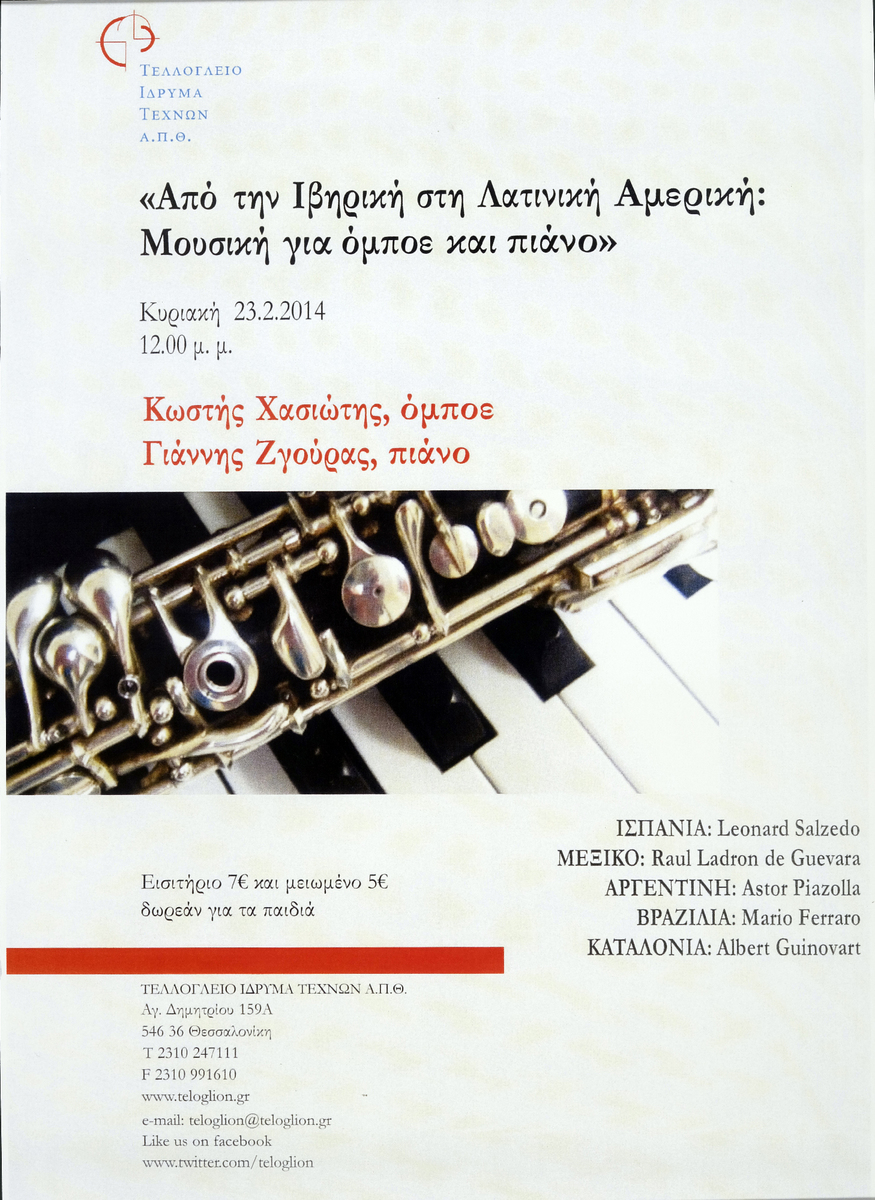 Αφίσα συναυλίας ισπανικής και λατινοαμερικάνικης μουσικής για όμποε (Κωστής Χασιώτης) και πιάνο (Γιάννης Ζγούρας), που πραγματοποιήθηκε στο Τελλόγλειο Ίδρυμα στη Θεσσαλονίκη.