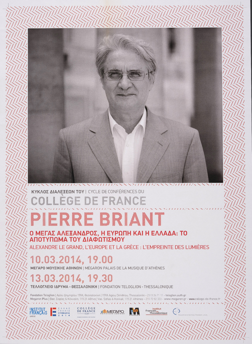 Αφίσα διάλεξης του ιστορικού Pierre Briant στο πλαίσιο του Κύκλου Διαλέξεων του Collège de France στο Τελλόγλειο Ίδρυμα στη Θεσσαλονίκη.