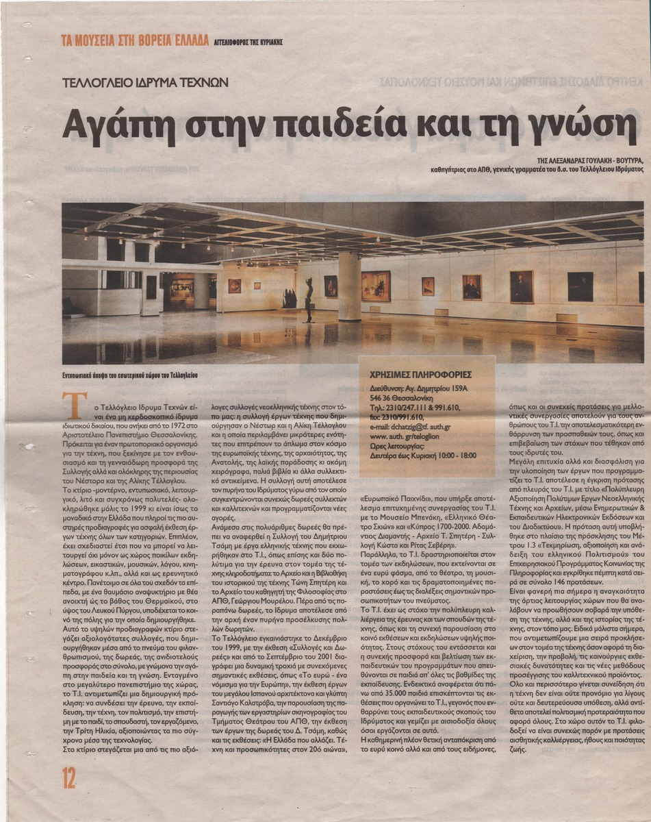 Απόκομμα της εφημερίδας «Αγγελιοφόρος» (08/02/2004) όπου δημοσιεύεται άρθρο για το Τελλόγλειο Ίδρυμα. Εντάσσεται σε αφιέρωμα του εντύπου με τίτλο «Τα Μουσεία στη Βόρεια Ελλάδα».