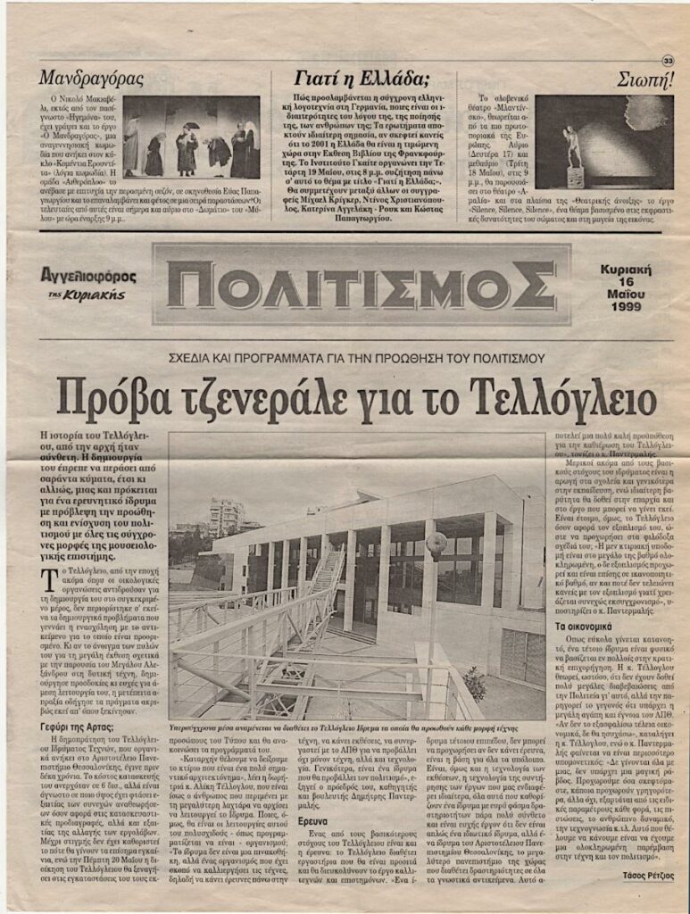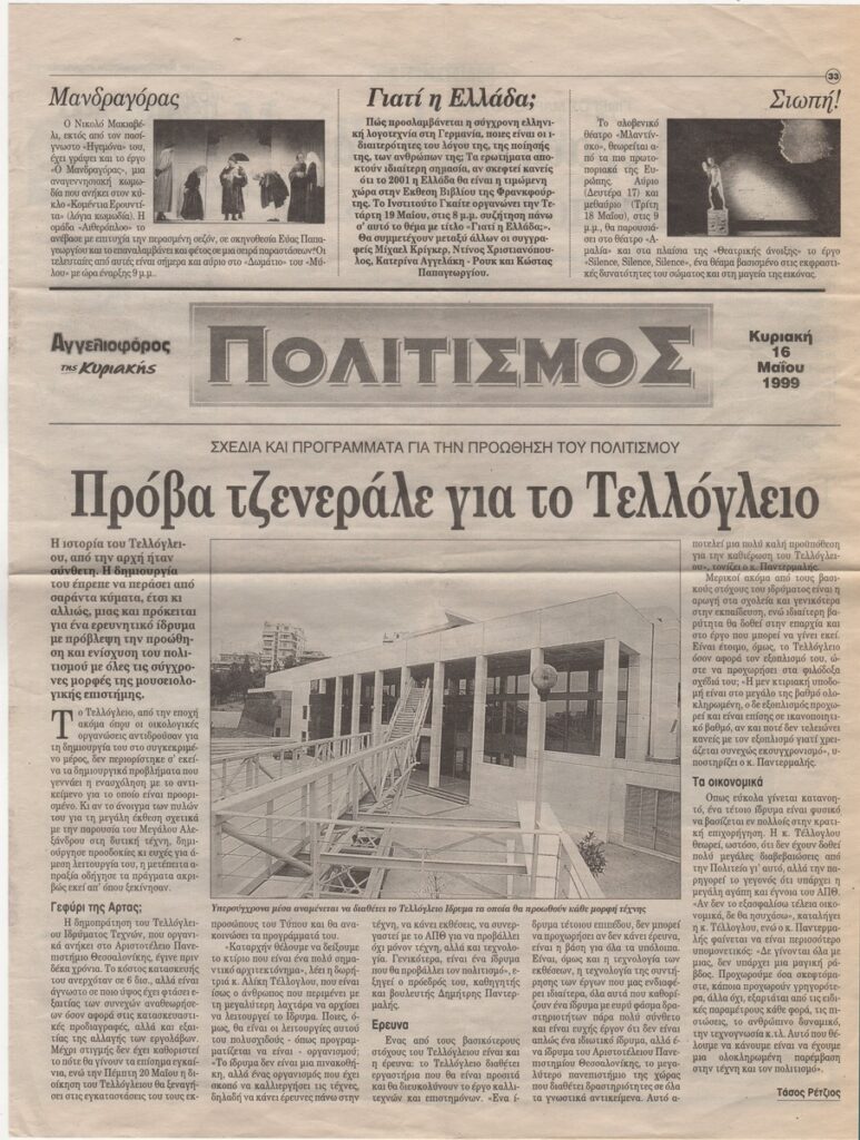 Απόκομμα της εφημερίδας «Αγγελιοφόρος της Κυριακής» (16/05/1999), όπου δημοσιεύεται άρθρο για την ίδρυση και λειτουργία του Τελλογλείου Ιδρύματος στη Θεσσαλονίκη.