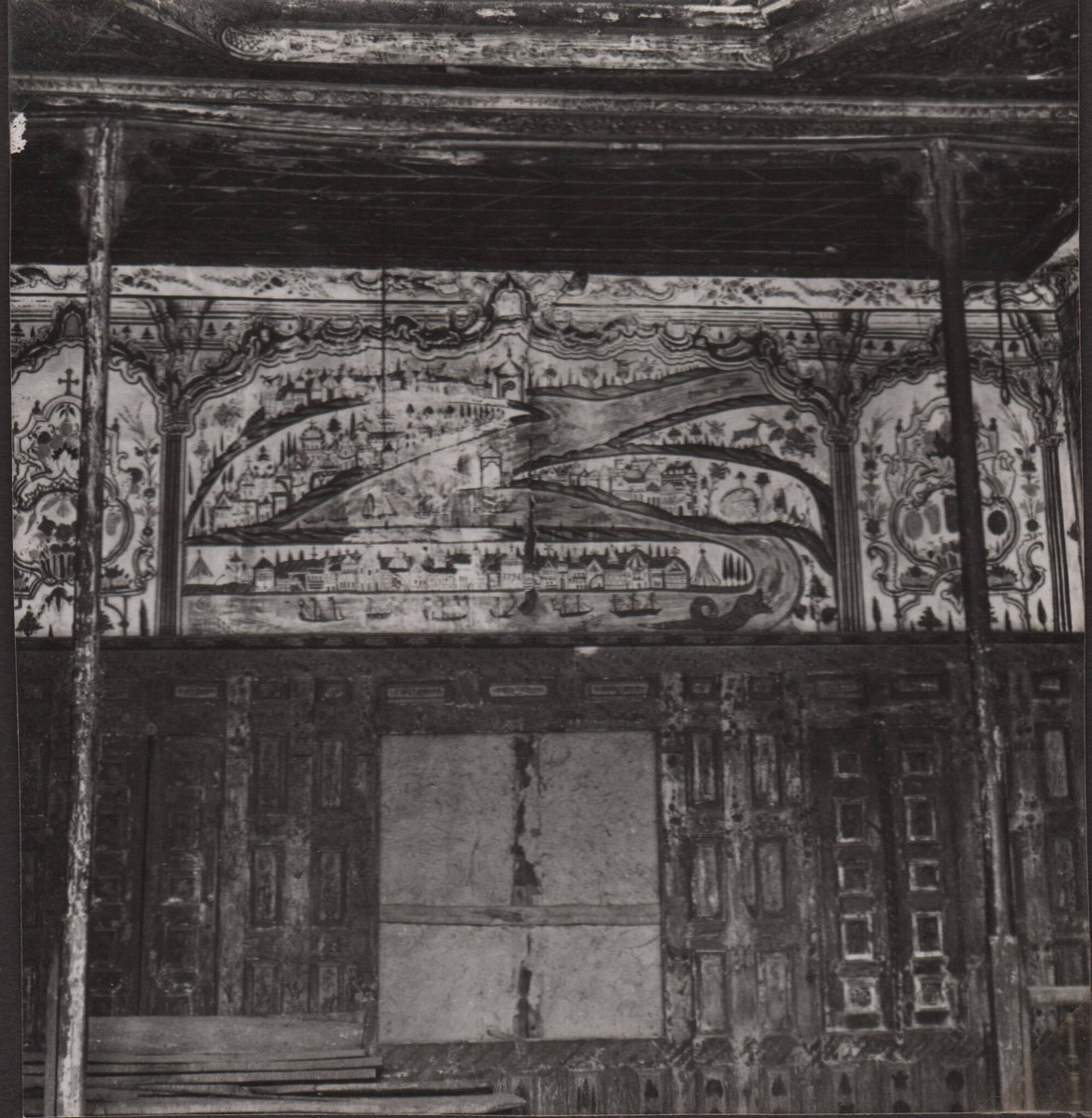 Ασπρόμαυρη φωτογραφία έργου του Παναγιώτη Ζωγράφου, το οποίο διακοσμεί την οικία Ναντζή στην Καστοριά. Η φωτογραφία είναι επικολλημένη σε χαρτόνι.