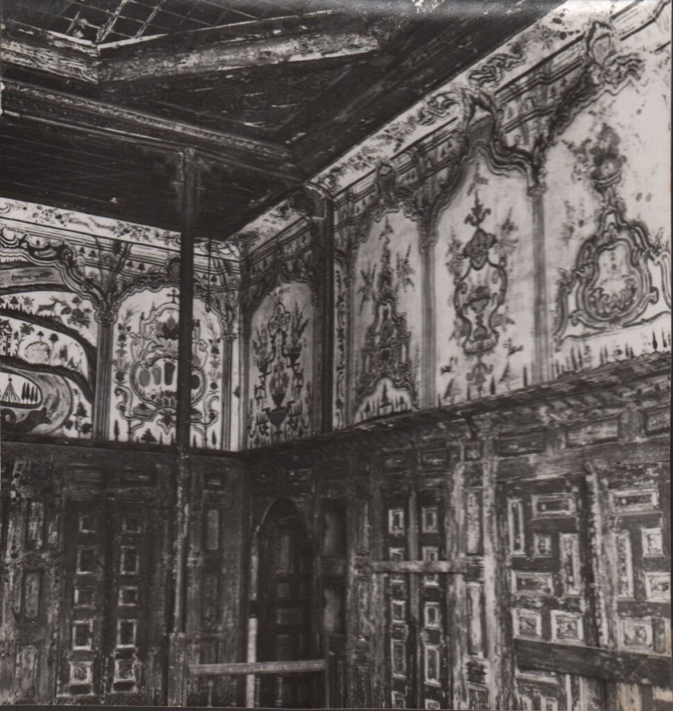 Ασπρόμαυρη φωτογραφία εσωτερικού χώρου της οικίας Ναντζή στην Καστοριά. Στην πίσω όψη της φωτογραφίας επιγραφή και σφραγίδα της φωτογράφου Μ. Χρουσάκη.