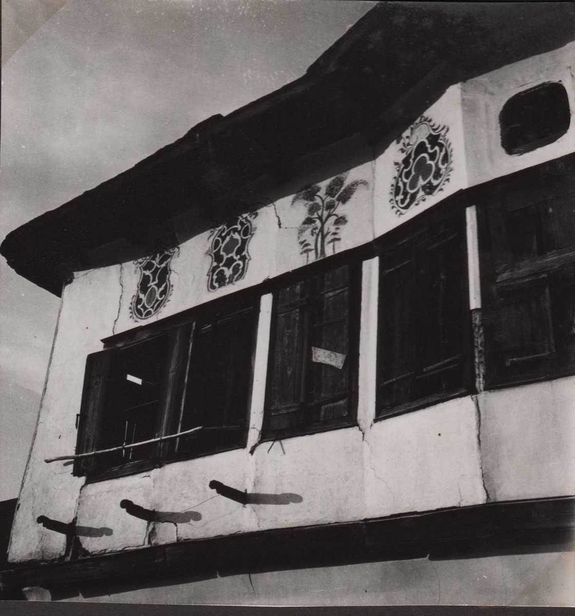 Ασπρόμαυρη φωτογραφία εξωτερικής όψης σπιτιού στην Πορταριά. Στην πίσω όψη, επιγραφή και σφραγίδα φωτογράφου.