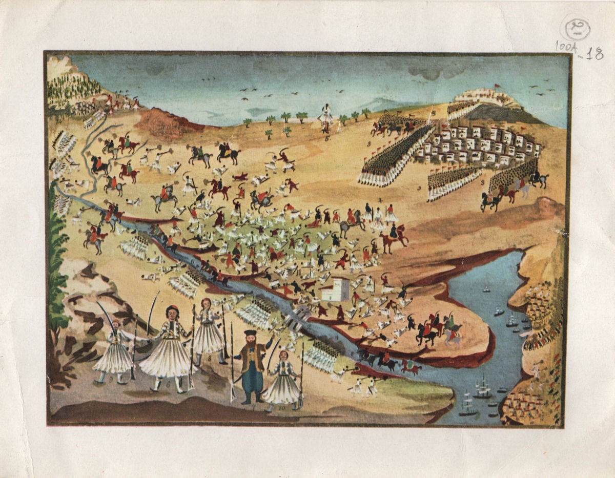 Στην πίσω όψη, λεζάντα εικονογράφησης: “Πρώτη Μάχη της Αλαμάνας” / “Battle of Alamana”- From a series of battle scenes executed between 1836 and 1839 by the “popular” painter Panagiotis Zographos according to eye-witness accounts by General Makriyannis. Copyright Athens Editions. Printed by Aspioti-Elka, Greece, 252.