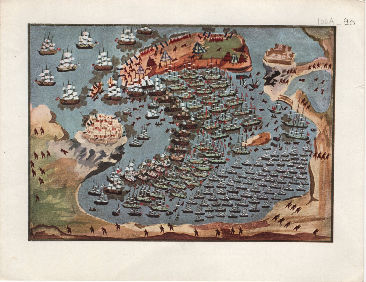 Στην πίσω όψη, λεζάντα εικονογράφησης: “Ναυμαχία των Παιλαιοναβαρίνων” / “Naval Battle of Old Navarin”. From a series of battle scenes executed between 1836 and 1839 by the “popular” painter Panagiotis Zographos according to eye-witness accounts by General Makriyannis. Copyright Athens Editions. Printed by Aspioti-Elka, Greece, 260.