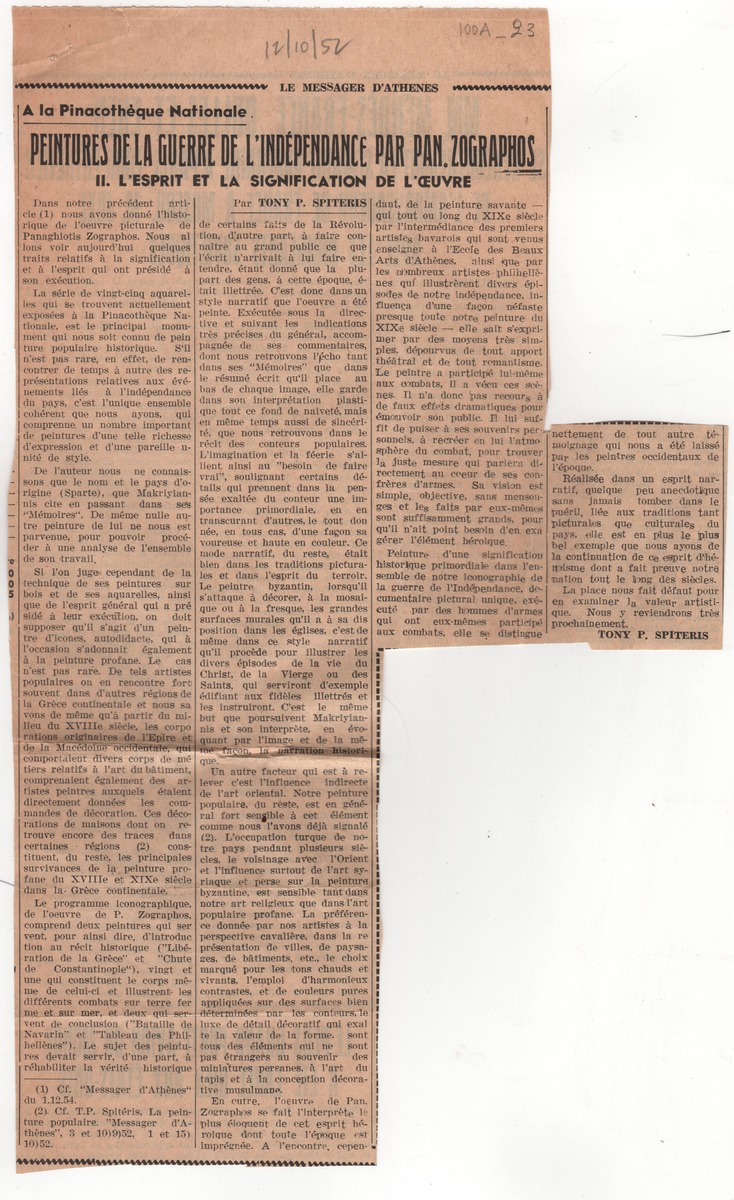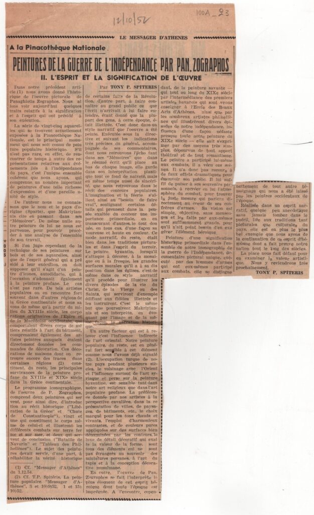 Απόκομμα της εφημερίδας “Le Messager d’ Athènes” (12/10/1952 ή 1954), όπου δημοσιεύεται άρθρο για τη ζωγραφική του Παναγιώτη Ζωγράφου, με αφορμή έκθεσή έργων του στην Εθνική Πινακοθήκη.