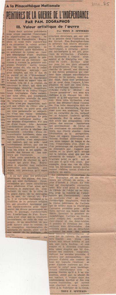 Απόκομμα, χαρτί ακανόνιστου μεγέθους, στα γαλλικά, δημοσίευσης άρθρου αναφερόμενου στην καλλιτεχνική αξία της ζωγραφικής του Παναγιώτη Ζωγράφου, με αφορμή έκθεση του στην Εθνική Πινακοθήκη.