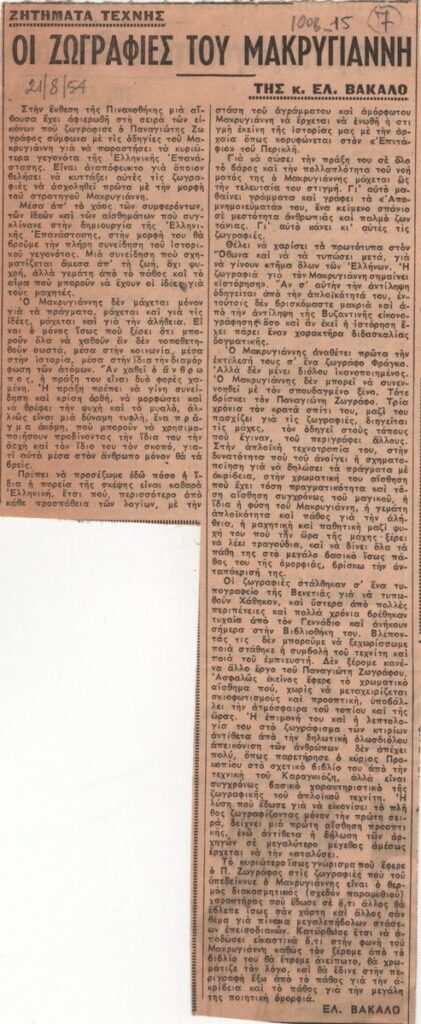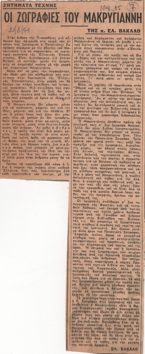 Απόκομμα εντύπου άγνωστου τίτλου (21/08/1954), όπου δημοσιεύεται άρθρο για την έκθεση έργων του Παναγιώτη Ζωγράφου, που φιλοτέχνησε υπό τις οδηγίες του στρατηγού Μακρυγιάννη με θέμα τα κυριότερα γεγονότα της Ελληνικής Επανάστασης στην Εθνική Πινακοθήκη.