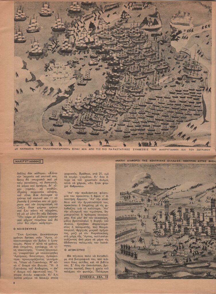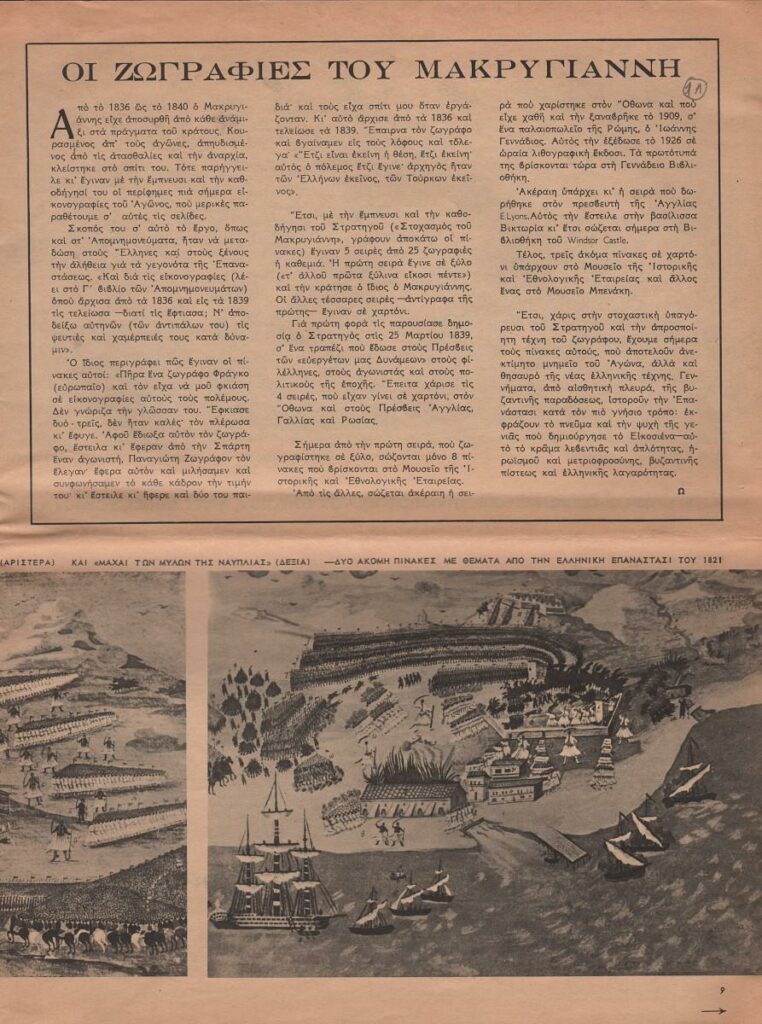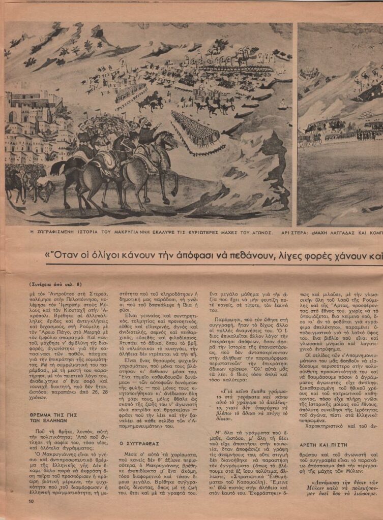 Απόκομμα περιοδικού, χαρτί, 7 φύλλα, 33×24,5 εκ., στα ελληνικά, δημοσίευσης αφιερώματος για τον Μακρυγιάννη. Περιέχει πληροφορίες για τα Απομνημονεύματα του στρατηγού καθώς και για τα έργα του Παναγιώτη Ζωγράφου, τα οποία ο καλλιτέχνης φιλοτέχνησε κατά παραγγελία και βάσει των διηγήσεων του στρατηγού, προκειμένου να μείνουν ντοκουμέντα των μαχών του Αγώνα.