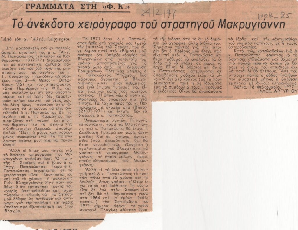 Απόκομμα της εφημερίδας «Η Καθημερινή» (24/02/1977), όπου δημοσιεύεται επιστολή του Αλέξανδρου Αργυρίου, αναφορικά με ανέκδοτο χειρόγραφο των Απομνημονευμάτων του στρατηγού Μακρυγιάννη.