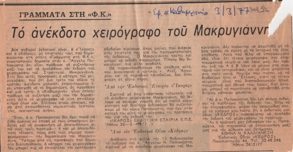 Απόκομμα της εφημερίδας “Η Καθημερινή” (03/03/1977), όπου δημοσιεύεται επιστολή της Αθηνάς Καλλιανέση, ιδρύτριας των εκδόσεων “Κέδρος”, αναφορικά με την έκδοση του χειρόγραφου των Απομνημονευμάτων του Μακρυγιάννη.