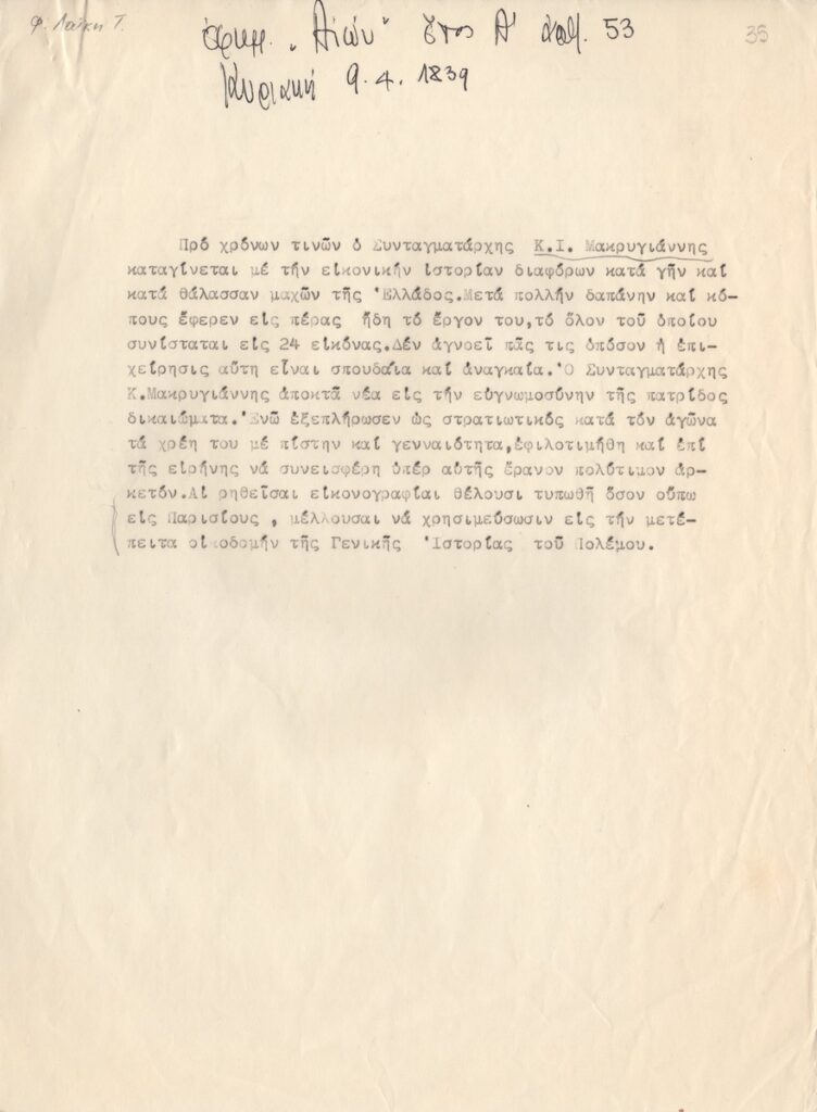 Δακτυλόγραφη αποδελτίωση άρθρου που δημοσιεύτηκε στην εφημερίδα «Αιών» (Έτος Α, 09/04/1839) και αφορά στην ολοκλήρωση ανατύπωσης έργων του Παναγιώτη Ζωγράφου, που φιλοτεχνήθηκαν υπό την καθοδήγηση του Μακρυγιάννη.