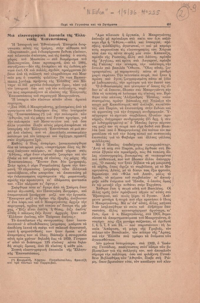 Απόκομμα του περιοδικού “Νέα Εστία” (01/05/1936), όπου δημοσιεύεται άρθρο με θέμα έκθεση έργων από τη δωρεά του φιλλέληνα Dr Jordan von Bassermann με θέμα την Ελληνική Επανάσταση, η οποία διεξάγεται στον Φιλολογικό Σύλλογο Παρνασσό στην Αθήνα, υπό τη διοργάνωση της Ιστορικής και Εθνολογικής Εταιρείας.