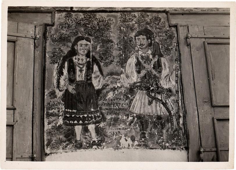 Ασπρόμαυρη εκτυπωμένη φωτογραφία έργου του Θεόφιλου. Στην πίσω όψη της φωτογραφίας, χειρόγραφη επιγραφή: Τοιχογραφία στην Καρήνη.